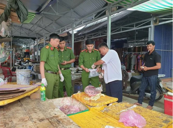 Cơ quan chức năng lấy mẫu thịt heo bày bán tại chợ xã Vĩnh Viễn sau khi phát hiện 1 con lợn nhiệm virus tả châu Phi được đưa ra chợ này tiêu thụ (Ảnh: TTXVN).