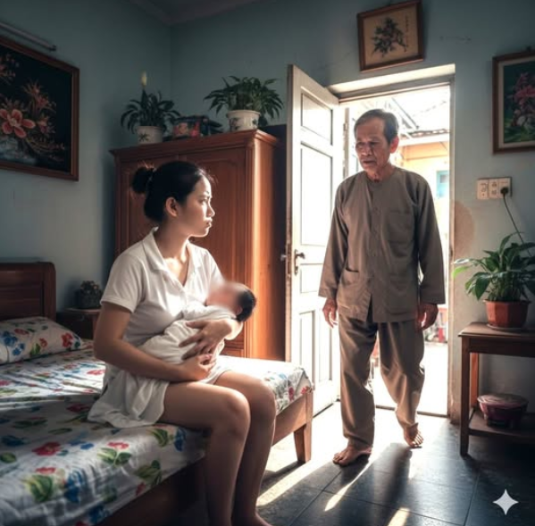 Tối hôm đó, khi tôi đang ngồi cho con bú trong phòng, ông bất ngờ đẩy cửa bước vào, không hề gõ. Ánh mắt ông nhìn chằm chằm vào tôi, vào đứa trẻ đang ngậm bầu ngực, khiến toàn thân tôi nổi da gà. Tôi vội kéo khăn che lại, hốt hoảng nói: