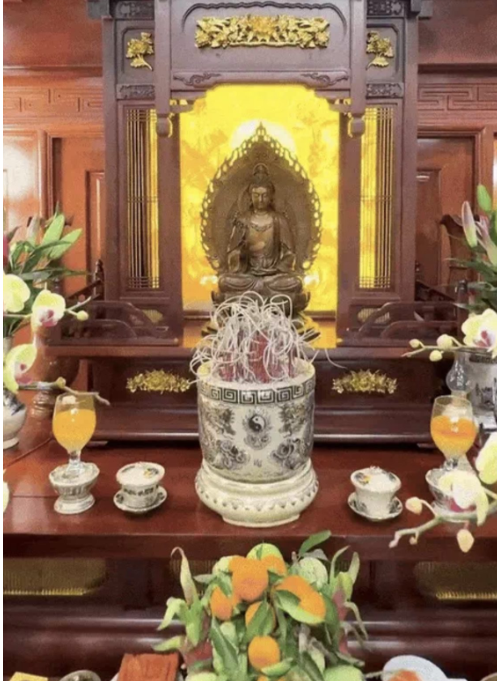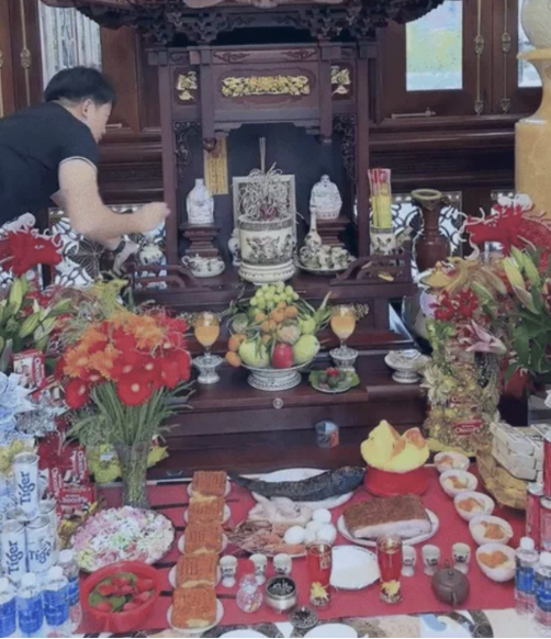 CEO Mailisa cũng chuẩn bị rất nhiều đồ lễ để dâng lên bàn thờ Thần Tài – Thổ Địa của gia đình. Bàn thờ được làm bằng gỗ, có kích thước cao và rộng vượt trội so với các mẫu thông thường, tạo cảm giác uy nghi và sang trọng. Xung quanh được trang trí cẩn thận với nhiều loại hoa đặc trưng như hoa lan, hoa đào, hoa loa kèn, hoa đồng tiền… Lễ vật dâng gồm đầy đủ các món mặn như cá lóc, thịt lợn quay, tôm, trứng, cùng các món ngọt và đồ chay như bánh mứt, kẹo lạc, bánh trôi, xôi gấc. Toàn bộ đều do chính tay vợ chồng Mailisa tự bày biện và sắp xếp, thể hiện sự chỉn chu và lòng thành kính trong từng chi tiết.