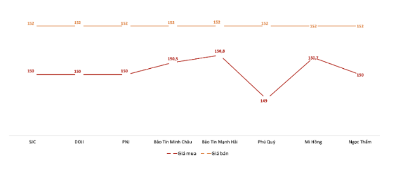 Mi Hồng là thương hiệu duy nhất ghi nhận giá mua vào tăng mạnh hơn giá bán ra. Kết phiên sáng, giá mua, bán vàng miếng tại thương hiệu này tăng lần lượt 1,9 triệu đồng/lượng và 1,8 triệu đồng/lượng. Thương hiệu này niêm yết giá mua vào vàng miếng SJC ở mức 150,7 triệu đồng/lượng còn giá vàng miếng bán ra là 152 triệu đồng/lượng.