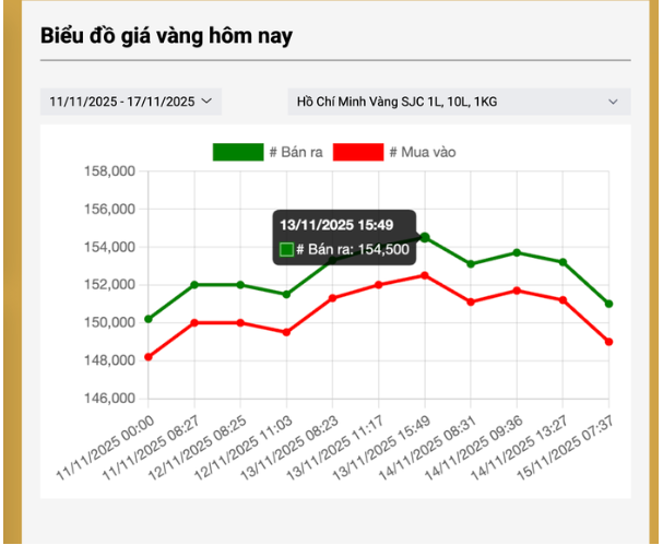 Mốc cao nhất của giá vàng miếng SJC trong tuần qua là 154,5 triệu đồng/lượng, áp sát mốc đỉnh lịch sử hồi tháng 10 vừa qua. Nguồn: công ty SJC