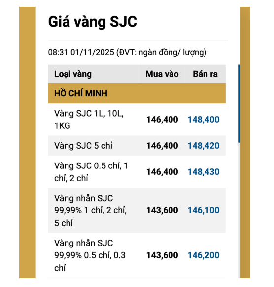 Trong nước tính tới 6 giờ sáng, giá vàng miếng SJC được các doanh nghiệp niêm yết quanh 146,4 triệu đồng/lượng mua vào và 148,4 triệu đồng/lượng bán ra. Giá vàng nhẫn mua vào ở mức 143,6 triệu đồng/lượng và 146,1 triệu đồng/lượng bán ra.