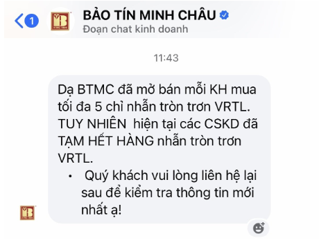 Ghi nhận của PV Dân Việt trong sáng ngày 10/11, các cơ sở kinh doanh của Bảo Tín Minh Châu (BTMC) trên “phố vàng” Trần Nhân Tông (Hà Nội) vừa mở bán ít giờ đồng hồ đã phải dừng bán. Nhiều người dân tranh thủ đội mưa đến mua khi giá vàng hôm nay tăng vọt, tuy nhiên hầu hết đều phải lặng lẽ ra về do cửa hàng thông báo hết hàng.