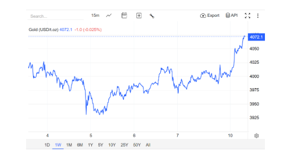 Giá vàng thế giới giao ngay trên thị trường châu Á lúc 13 giờ 45 phút ngày 10/11 (giờ Việt Nam) giao dịch ở quanh ngưỡng 4.072 USD/ounce, tăng mạnh 73 USD/ounce so với chốt phiên giao dịch tuần vừa qua. Đây cũng là mức giá cao nhất trong vòng 2 tuần qua.