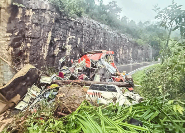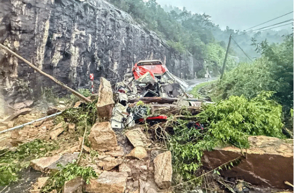 Khối đất đá tràn vào chiếc xe khách 40 chỗ Phương Trang biển số 59H-53114 đang chạy tuyến Đà Lạt – Quảng Ngãi, trên xe có 32 người (29 hành khách, 2 tài xế và 1 phụ xe).