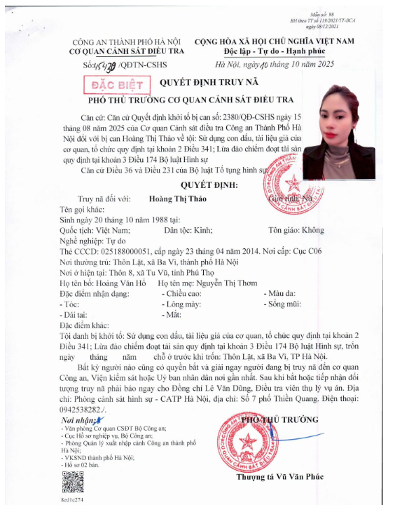 Quyết định truy nã Hoàng Thị Thảo. Ảnh: CQCA